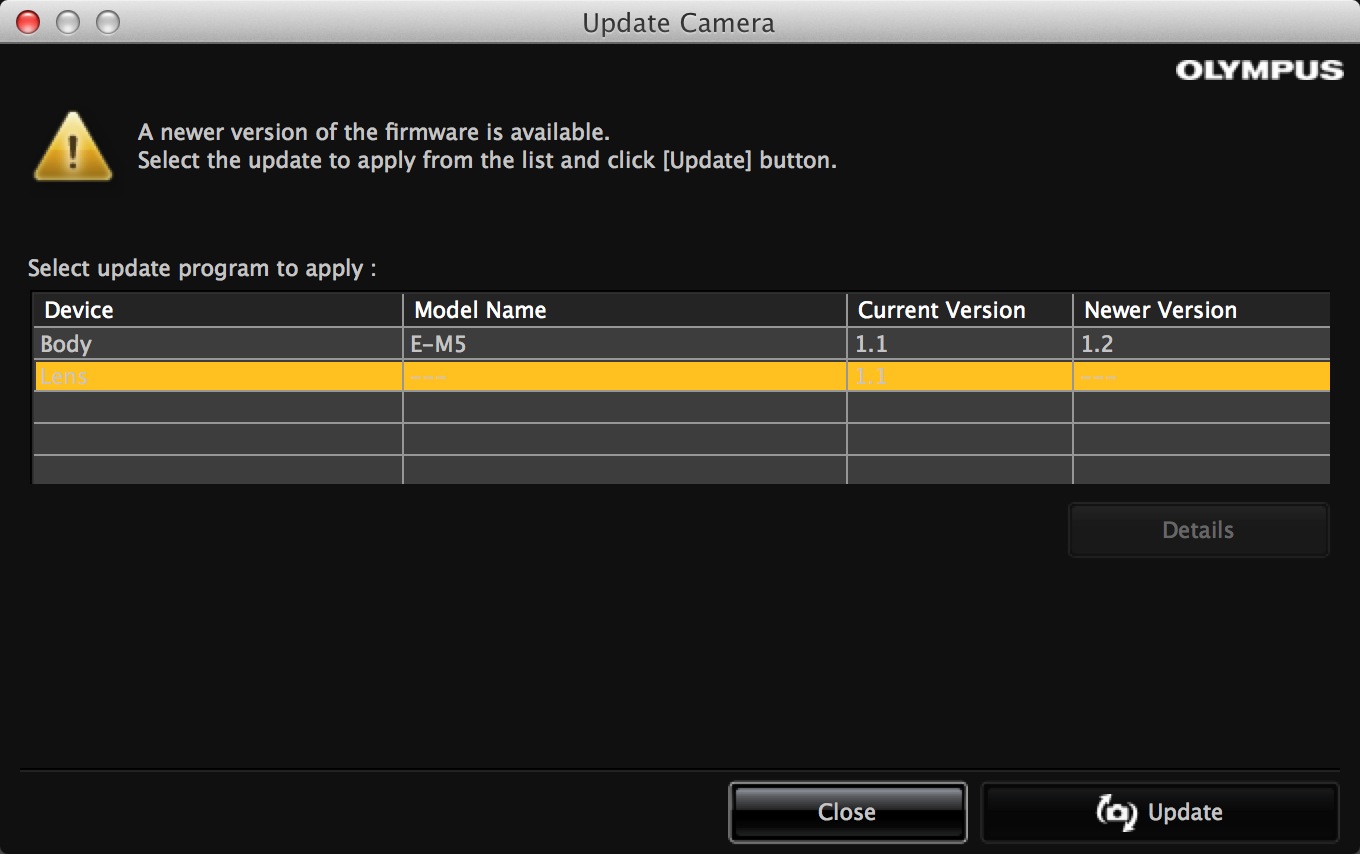 In Olympus Viewer on your computer, go back to Camera > Update Camera. The software will check the firmware for both the camera body and the lens. It will then list the available updates.