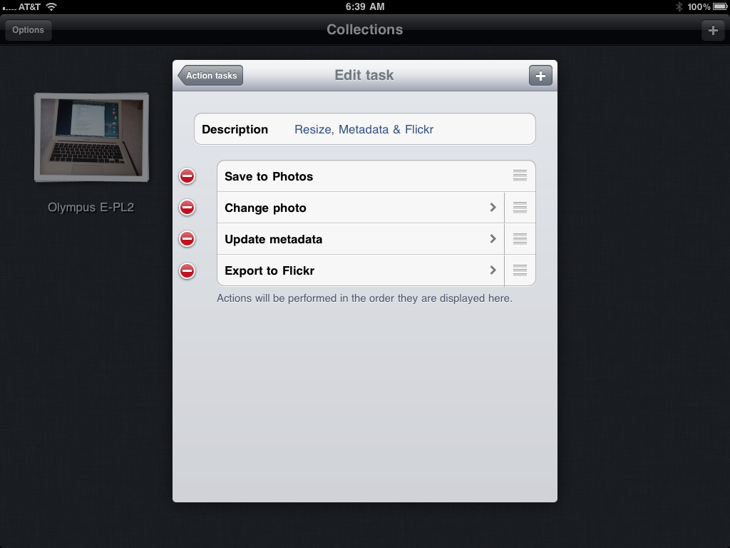 Aside from being very fun, why would I want to add this second iPad workflow to my shooting? Two reasons: I get to view the photos in semi-realtime on the iPad as I'm working. This is particularly cool when capturing portraits. The subject gets feedback during the session. The second reason is that I can post images to Flickr (or where ever) very quickly with this system. In part, this is due to a major improvement in ShutterSnitch called Actions.